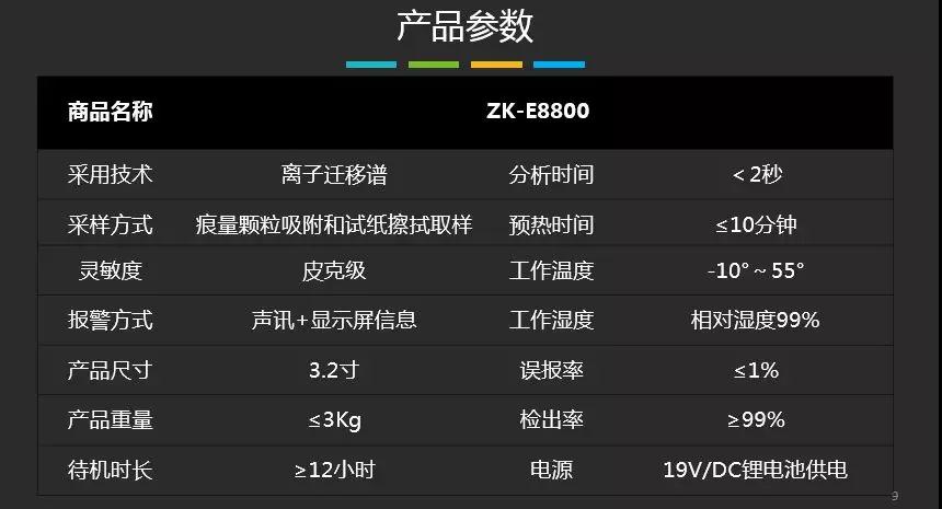 便攜式爆炸物毒品探測儀ZK-E8800是由中控門禁自主研發、生產的爆炸物和毒品檢查設備。該產品基于國際上先進的離子遷移譜(IMS)技術原理,能夠快速、精準地檢測并判斷痕量爆炸物及毒品的種類,具有快速、準確地檢測痕量爆炸物、毒品的功能,產品性能達到同類產品國際先進水平,具有易于使用,耗材成本低和維護方便等優勢。
