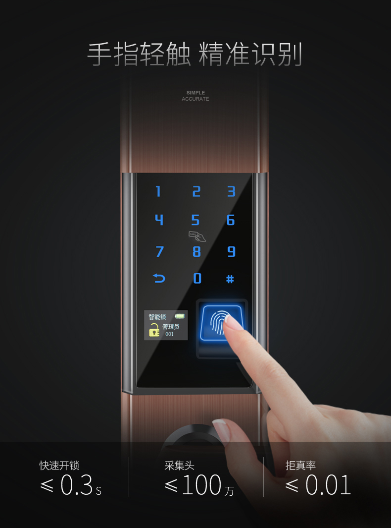 雖然如此,如果比較起來的話,指紋鎖還是比密碼鎖好用。因為指紋鎖只需要指紋在指紋鎖頭上按一下就好了,而密碼鎖則需要輸入一連串的數字才行,從開鎖的效率上要低一些。而且密碼鎖是需要記住密碼的,一家人使用,倘若是一個新的密碼,開始用的時候會比較費事。但如果是輸入指紋的話,一家人是沒有這么大的使用門檻的。密碼鎖還有一個問題就是,密碼如果被人看了去,就容易打開家門。當然在安全性上,以前的指紋鎖也不一定就比密碼鎖高多少,因為以前的指紋鎖大多采用光學指紋頭,所以容易被復制的指紋打開。但指紋與密碼的開鎖方式,往往是出現在同一款鎖上的,這樣用起來也可以避免單用一種打不開的情況——下圖的玻璃門智能鎖就是這樣,此外還帶了半導體指紋頭和虛位密碼設計,安全性有了提高。