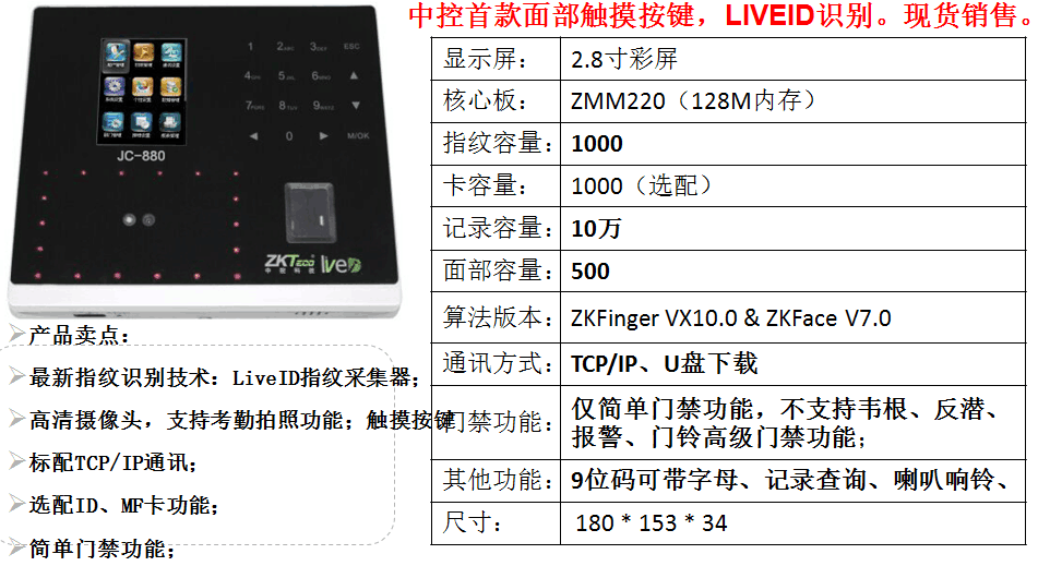 面部識別考勤機zk-jc880 磁吸式門禁系統