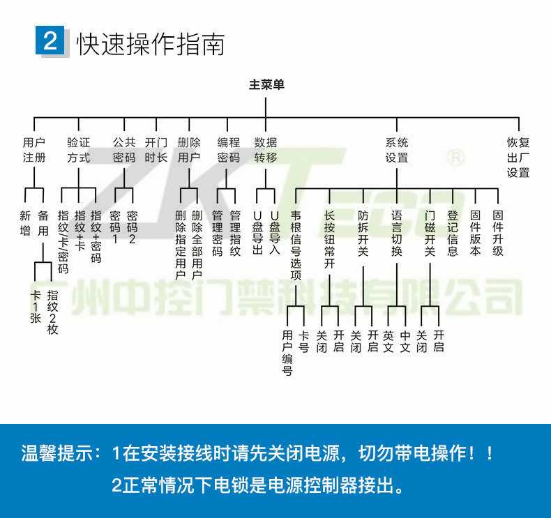 1、初始編程密碼為:9999。 2、編程狀態(tài): 按 * 編程密碼 # 進入編程狀態(tài)。按 * 可退出編程狀態(tài) ,或者無任何操作十秒鐘后自動退出。 3、按鍵說明: 【*】按鍵為進入或退出編程模式 【#】按鍵為確認鍵或門鈴按鈕 【2】、【8】按鍵進入多級菜單后為上翻與下翻鍵 4、使用方法: (1)正常工作狀態(tài)按用戶指紋、讀用戶卡或輸入正確的開門密碼即可開門。 (2)如果忘記編程密碼了,可以把門禁機拆下來恢復編程密碼。 (注:如要刪除全部用戶信息,需進入主菜單,進行“恢復出廠設置”)